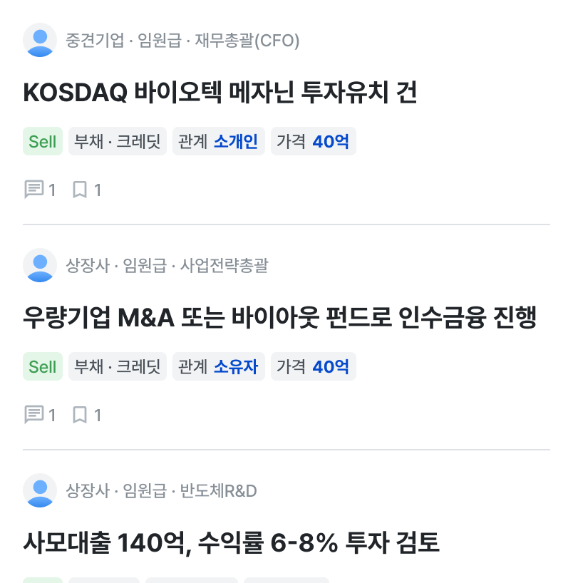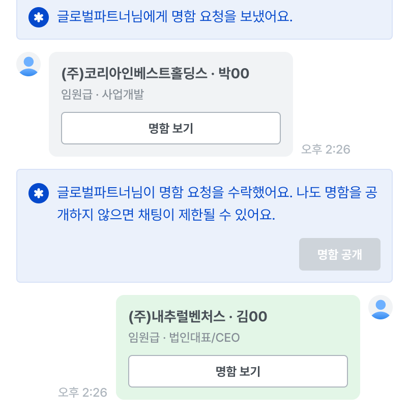 기업유형, 직무, 직책을 바탕으로익명의 상대와 딜을 논의하고 신뢰가 쌓이면명함 교환 이후 미팅을 진행하세요.